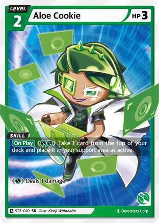 Skill- (On Play) <{G}{G}> Take 1 card from the top of your deck and place it in your support area as active. Attack- <{G}> Deals 1 damage.